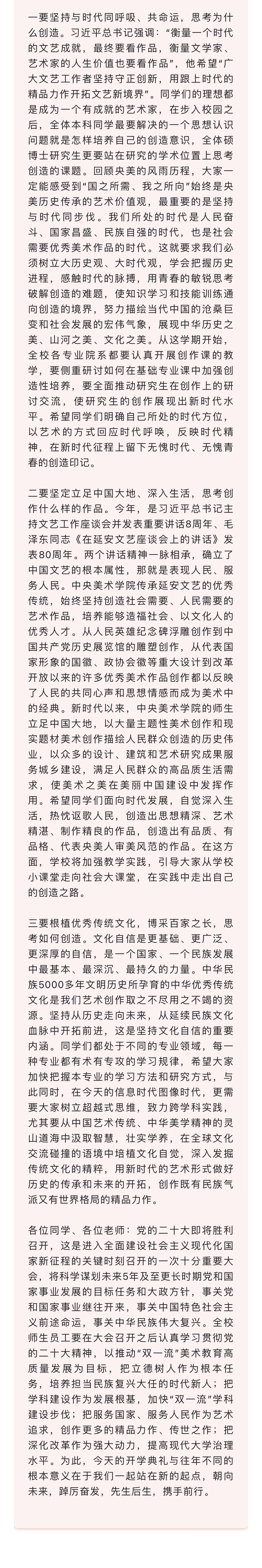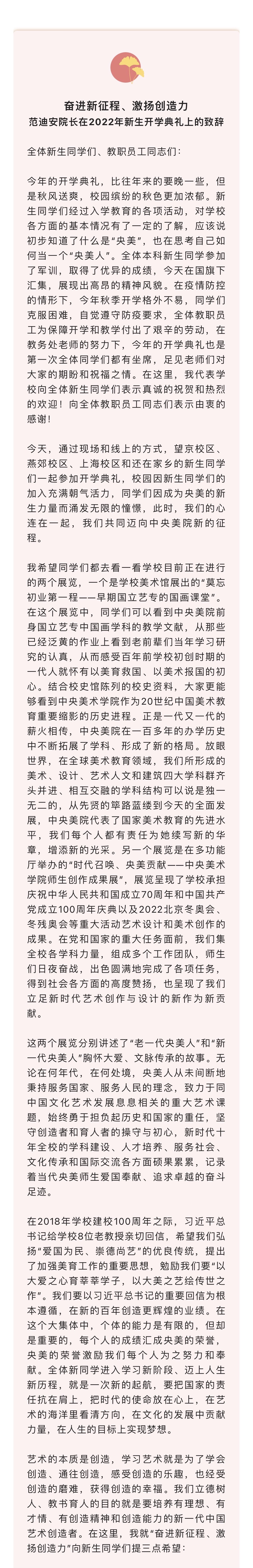 “今天,望京校区、燕郊校区、上海校区和还在家乡的新生同学们通过现场和线上的方式,一同参加开学典礼,校园因你们的加入充满朝气活力,同学们也因成为央美的新生力量而涌发无限的憧憬,此时,我们的心连在一起,我们共同迈向中央美院新的征程。”中央美院院长范迪安在开学典礼上欢迎2022级新生的到来,并希望同学们能够参观正在学校展出的两个展览:一是美术馆展出的“莫忘初业第一程——早期国立艺专的国画课堂”,从中感受百年前学校初创时期的一代人就怀有以美育救国、以美术报国的初心;一是在多功能厅举办的“时代召唤、央美贡献——中央美术学院师生创作成果展”,呈现了美院人在党和国家的重大任务面前,集全校各学科力量,立足新时代艺术创作与设计的新作为新贡献。这两个展览分别讲述了“老一代央美人”和“新一代央美人”胸怀大爱、文脉传承的故事。范迪安表示,无论在何年代,在何处境,央美人从未间断地秉持服务国家、服务人民的理念,致力于同中国文化艺术发展息息相关的重大艺术课题,始终勇于担负起历史和国家的重任,坚守创造者和育人者的操守与初心,新时代十年全校的学科建设、人才培养、服务社会、文化传承和国际交流各方面硕果累累,记录着当代央美师生爱国奉献、追求卓越的奋斗足迹。
