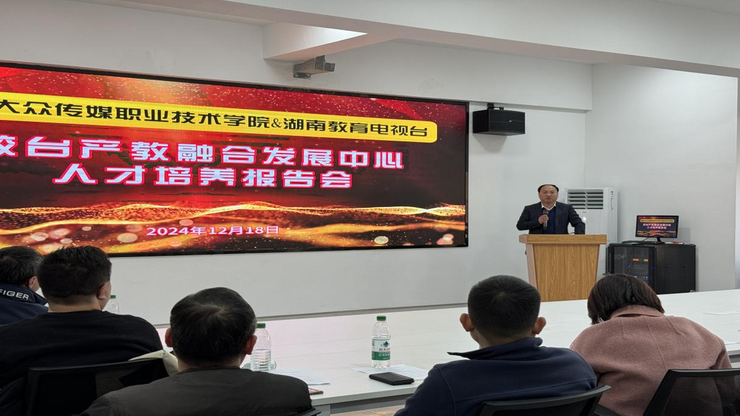 12月8日,湖南大众传媒职业技术学院举行首场校台产教融合人才培养报告会,近百名师生齐聚在由该校和湖南教育电视台共建的校台产教融合发展中心,听取校台协同育人的阶段性成果汇报,共同展望携手推进产学研深度融合的新篇章。
